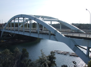 志摩大橋 三重県志摩町の伊勢志摩国立公園内に志摩大橋(通称:志摩パールブリッジ)が完成。10月10日に開通した。同県が志摩町の布施田から御座までの5437mをバイパスとして整備する事業の一環。2003年度までに3270mが開通しており,今回の開通で新たに930mの区間が通行可能となった。志摩大橋は全長582m,幅員12.5m。中央部分はニールセンローゼ橋,両端部分は連続ばん桁橋となっている。ニールセンローゼ橋部分は橋長234mで,同構造としては全国で四番目に長い。橋の架設では,部材を別の場所でアーチ状に組み立てた後,台船で運ぶ台船一括架設工法を採用した。(日経コンストラクションより) |