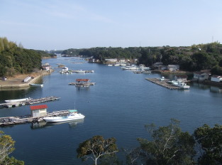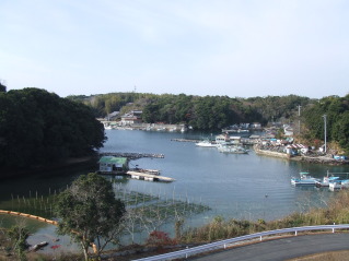 長田橋より北を望む 長田橋の西側に小さな公園(長田橋小公園)があります。ここには英虞湾を望める展望台があり、また昭和62年には当時の建設大臣より「日本の道100選」に選ばれ、記念碑も建っています。 |