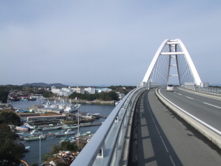 長田橋(志摩町片田) 真珠の海(英虞湾)に架かる長田橋は、昭和59年に完成しました。全長115mです。 |
