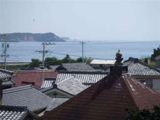 如意庵寺より大王崎を望む 手前、三蔵寺 円空の彫刻でも知られています。旧町の中心部の面影を残しています。 |